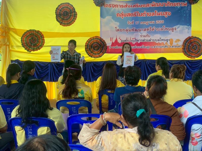 รายละเอียด : กลุ่มพัฒนาสตรีตำบลโพนสูง ร่วมกับองค์การบริหารส่วนตำบลโพนสูง จัดทำโครงการส่งเสริมและพัฒนาศักยภาพกลุ่มสตรี ตำบลโพนสูง ประจำปีงบประมาณ 2568 ในวันที่ 17 กรกฎาคม 2568 ระหว่างเวลา 08.00 - 15.00 น. ณ องค์การบริหารส่วนตำบลโพนสูง อำเภอสว่างแดนดิน จังหวัดสกลนคร โดยมีวัตถุประสงค์เพื่อเสริมสร้างศักยภาพในการพัฒนาตนเองของสตรีให้เป็นที่ยอมรับต่อสังคม ส่งเสริมการจัดกิจกรรมที่แสดงศักยภาพของกลุ่มสตรี เสริมสร้างความรู้ ทักษะ และเพิ่มขีดความสามารถต่อการพัฒนาความเป็นผู้นำของสตรีในการที่จะบริหารจัดการองค์กรสตรีให้มีประสิทธิภาพ พัฒนาและสร้างความเชื่อมั่นให้ผู้นำสตรีมีความเข้มแข็ง เป็นฐานพลังในการขับเคลื่อนกิจกรรมต่างๆ เพื่อเป็นการสร้างและพัฒนาเครือข่ายเพื่อป้องกันและแก้ไขปัญหายาเสพติด ตามนโยบายของรัฐบาลให้บรรลุผลสำเร็จตามเป้าหมาย กระตุ้นให้ผู้นำสตรีมีความรู้ความสามารถ และเป็นต้นแบบในการพัฒนาตน เพื่อขยายผลแก่สตรีกลุ่มอื่นๆต่อไป