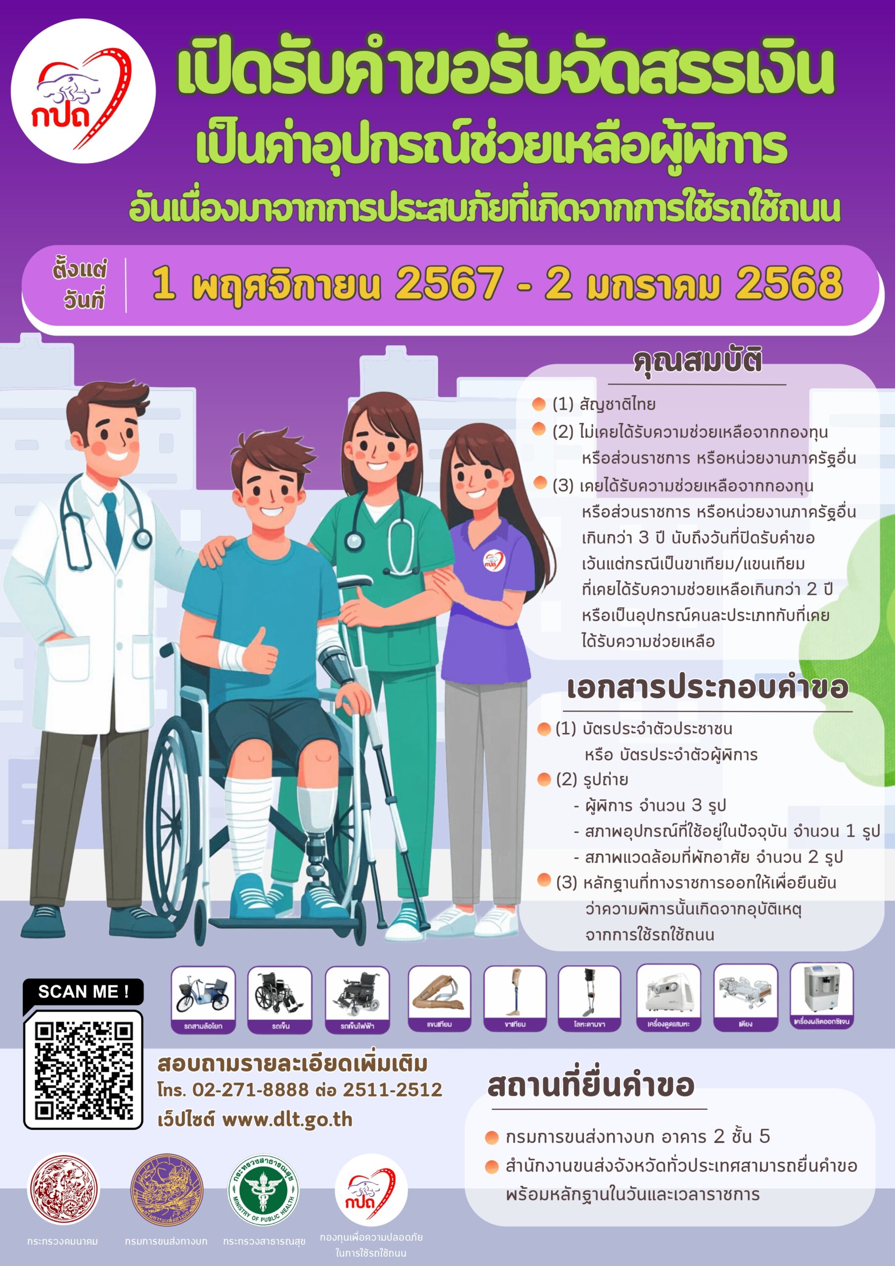 รายละเอียด : ประชาสัมพันธ์การเปิดรับคำขอรับจัดสรรเงินค่าอุปกรณ์ช่วยเหลือผู้พิการอันเนื่องมาจากการประสบภัยที่เกิดจากการใช้รถใช้ถนน ประจำปีงบประมาณ พ.ศ.2568 (ตั้งแต่วันที่ 1 พฤศจิกายน 2567 - 2 มกราคม 2568)