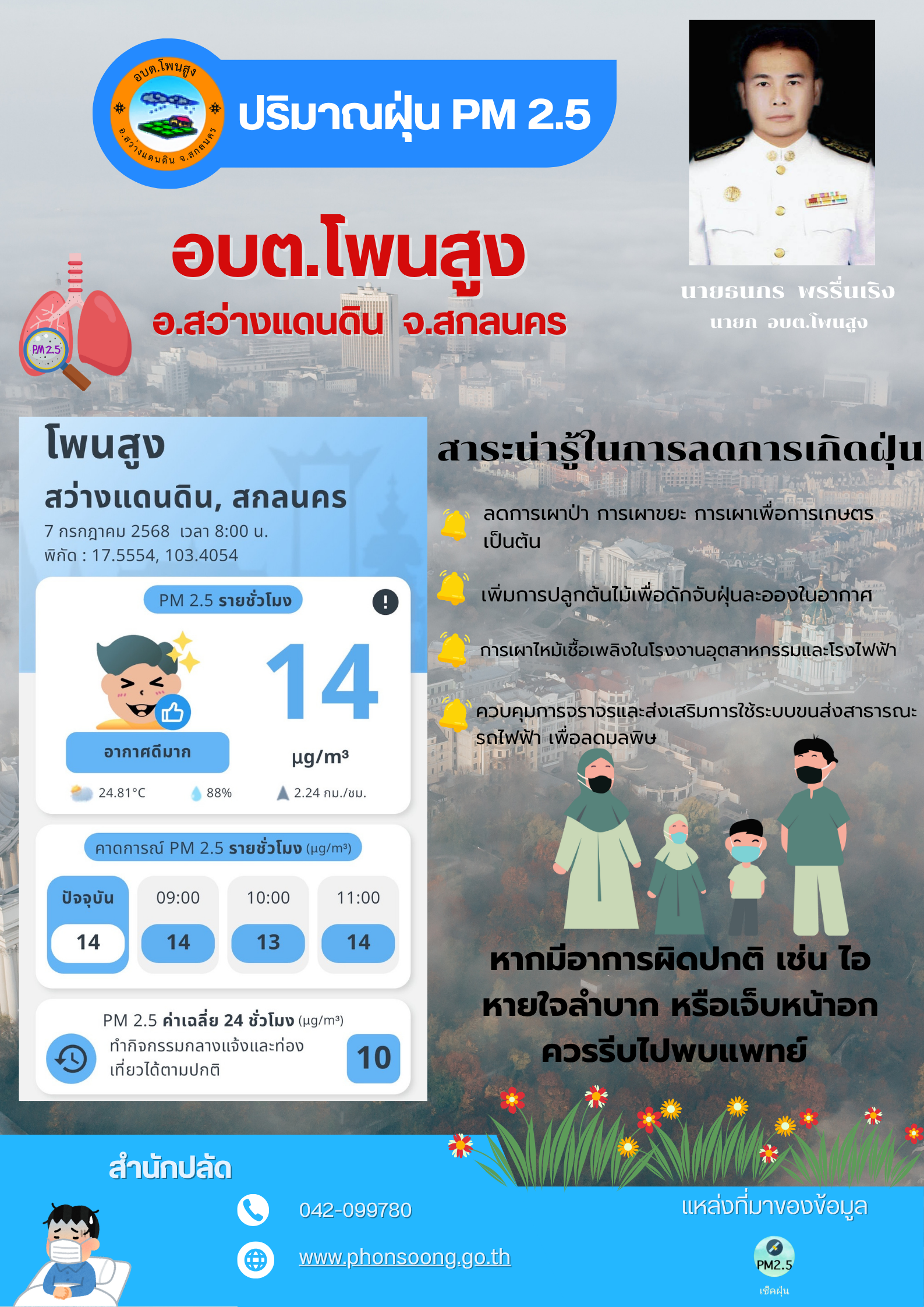รายงานค่าฝุ่น PM 2.5 ประจำวัน วันที่ 7 กรกฎาคม 2568